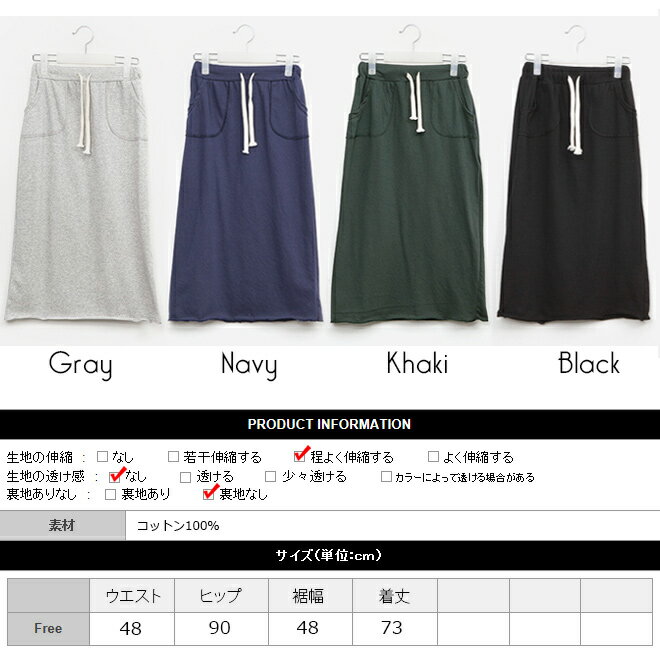 ロングスカート タイト ロングス ロングスカート ロンスカ タイト タイトロングスカート マキシ 無地ロングスカート スウェットロングスカート 20代 30代 40代 50代 黒スカート グレースカート カーキスカート ネイビースカート 春 夏 春夏 春ロングスカート 夏ロングスカートPRODUCT INFORMATION 生地の伸縮 : なし 若干伸縮する 程よく伸縮する よく伸縮する 生地の透け感 : なし 透ける 少々透ける カラーによって透ける場合がある 裏地ありなし : 裏地あり 裏地なし 素材 コットン100% サイズ(単位:cm) ウエスト ヒップ 裾幅 着丈 Free 48 90 48 73 モデルサイズ 46kg, 163cm、モデルFreeサイズ着用 スタッフコメント ロングスカート タイト ロングス ロングスカート ロンスカ タイト タイトロングスカート マキシ 無地ロングスカート スウェットロングスカート 20代 30代 40代 50代 黒スカート グレースカート カーキスカート ネイビースカート 春 夏 春夏 春ロングスカート 夏ロングスカート カジュアルに着れる♪