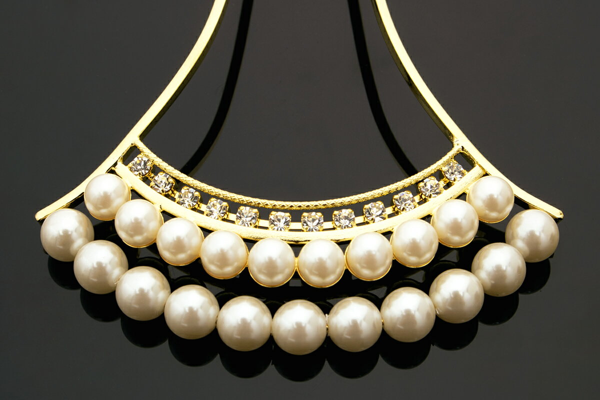 大小のフェイクパールを二列にあしらい、クリスタルビーズを施した装飾が上品でエレガントなデザインです。