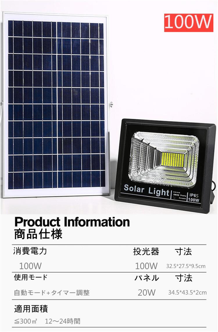 ・中国製 ●仕様LED Power:100W光源:昼白色全光束:9500lm照射角:約120°LED寿命:約40,000時間コード長さ:4.5〜5m(ライト本体配線+パネルの配線)防水等級:IP65サイズ:ライト:約W325×H273×D87 mm /重量約2300gソーラーパネル:約W450×H350×D20 mm /重量約1500g(配線コード含む約1700g)付属品:リモコン、固定用ボルト点灯時間:約10〜20 時間充電時間:約8〜10時間※注意・ソーラーパネルは必ず日光が当たる場所に設置してください。